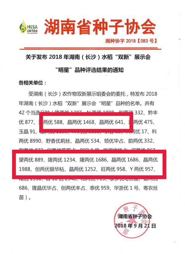 經(jīng)過(guò)專(zhuān)家組嚴(yán)苛的現(xiàn)場(chǎng)評(píng)議、綜合打分,亞華集團(tuán)2018年“雙新”“明星”品種再續(xù)佳績(jī),6大品種獲此榮譽(yù):晶兩優(yōu)1468、晶兩優(yōu)641、隆兩優(yōu)1234、隆兩優(yōu)1686、晶兩優(yōu)1686、晶兩優(yōu)1988;加上去年的隆兩優(yōu)1308、隆兩優(yōu)華占、隆兩優(yōu)1988、隆兩優(yōu)1212、晶兩優(yōu)1212、隆晶優(yōu)1號(hào),亞華集團(tuán)共計(jì)12大品種獲得“雙新”展示會(huì)“明星”品種殊榮。