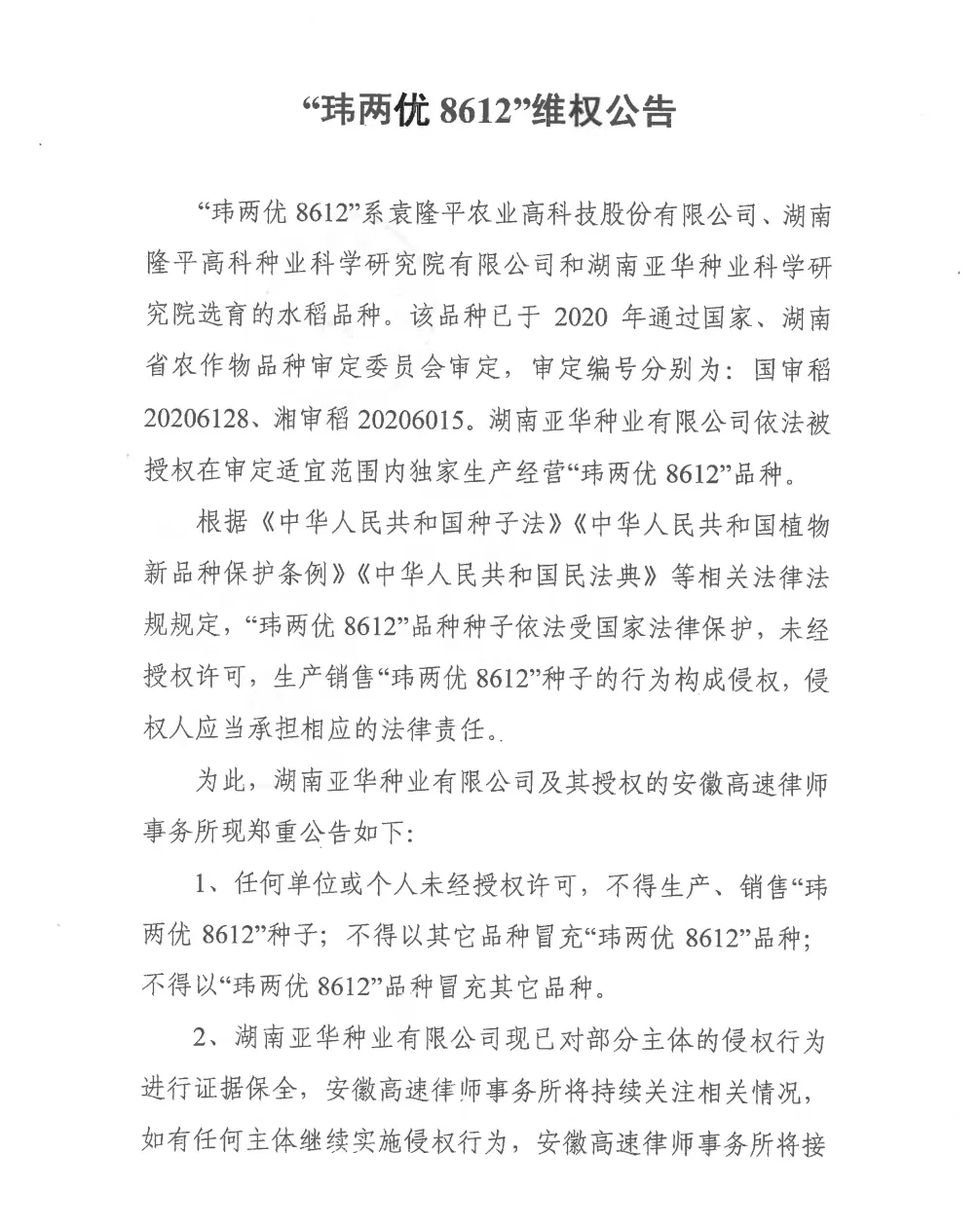 “瑋兩優(yōu) 8612”維權(quán)公告