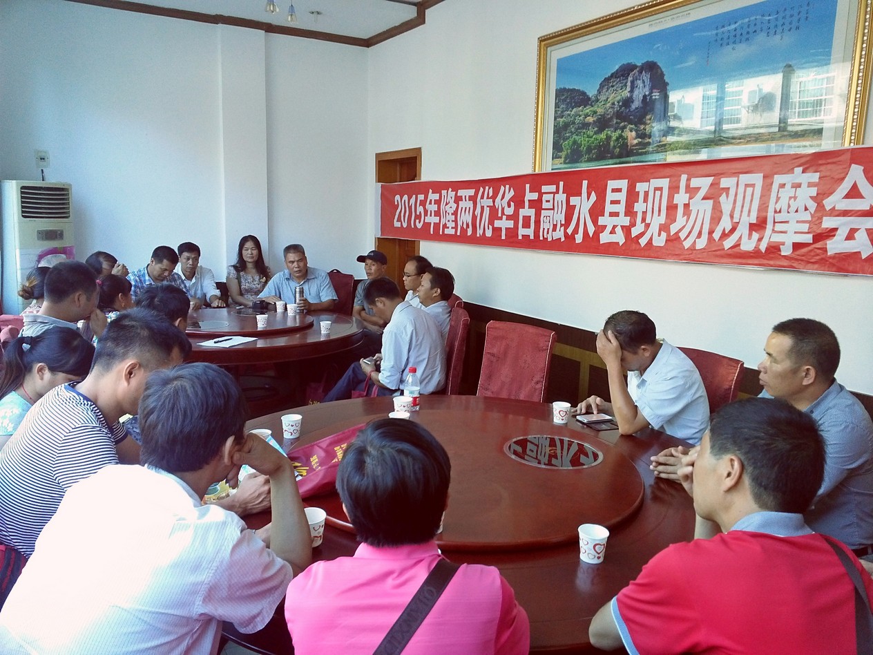 在室內(nèi)會(huì)議上,由廣西分公司區(qū)域張經(jīng)理首先把隆兩優(yōu)華占基本特征特性以及全國(guó)各個(gè)地方的表現(xiàn)進(jìn)行介紹和分享。隆兩優(yōu)華占是一個(gè)抗稻瘟病、優(yōu)質(zhì)、高產(chǎn)、抗倒、抗逆性強(qiáng)以及株葉形態(tài)等群體結(jié)構(gòu)非常協(xié)調(diào)的好品種。融水是一個(gè)典型的山區(qū),稻瘟病也很?chē)?yán)重,隆兩優(yōu)華占符合山區(qū)老百姓選擇品種,首先要抗稻瘟病,再到米質(zhì)和高產(chǎn)的順序,大公司、大品牌,相對(duì)省心、安全和保障!二是要求零售商在山區(qū)中稻即將成熟時(shí),及時(shí)召開(kāi)各鄉(xiāng)鎮(zhèn)、重點(diǎn)村隆兩優(yōu)華占農(nóng)民會(huì),進(jìn)行田間插牌、進(jìn)村入戶(hù)大面積宣傳;有條件的鄉(xiāng)鎮(zhèn),提前進(jìn)行大戶(hù)預(yù)定。最后融水縣農(nóng)業(yè)局高級(jí)農(nóng)藝師梁代林總結(jié)說(shuō):“隆兩優(yōu)華占確實(shí)是一個(gè)難得的好品種,在各個(gè)方面表現(xiàn)都非常好。今年7月初,天氣異常地?cái)?shù)天狂風(fēng)和大雨,旁邊的許多品種都倒伏了(包括我自己做的小區(qū)十幾個(gè)示范品種,全部倒了),而隆兩優(yōu)華占沒(méi)有倒伏,表現(xiàn)出驚人的抗倒力。”緊接著,梁主任對(duì)零售商提出了隆兩優(yōu)華占明年的擴(kuò)大示范計(jì)劃,全力開(kāi)展好各個(gè)地方的插牌、農(nóng)民會(huì)、現(xiàn)場(chǎng)會(huì)等工作。零售商紛紛表示贊同,隆兩優(yōu)華占確實(shí)是個(gè)難得的優(yōu)勢(shì)品種,會(huì)做好開(kāi)現(xiàn)場(chǎng)會(huì)和預(yù)定的準(zhǔn)備,明年一定要做好示范和推廣!