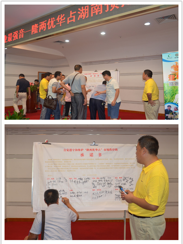 寧鄉(xiāng)歐總、汨羅喻總、祁陽曹總、洞口劉總、漢壽周總等經(jīng)銷商代表也紛紛上臺作出講話,首先他們都高度贊揚了隆兩優(yōu)華占表現(xiàn)出的高產(chǎn)、抗病、抗倒、再生力強(qiáng)、米質(zhì)優(yōu)等優(yōu)秀品質(zhì),并且一致認(rèn)同亞華種業(yè)這次在預(yù)定方式上做的改革。在市場規(guī)范方面,經(jīng)銷商們都積極、主動、自發(fā)地簽署了“隆兩優(yōu)華占市場秩序維護(hù)承諾書”,并且表示從大局來看,這是人人都必須遵守的規(guī)則,是實現(xiàn)共贏的堅實基礎(chǔ)。
