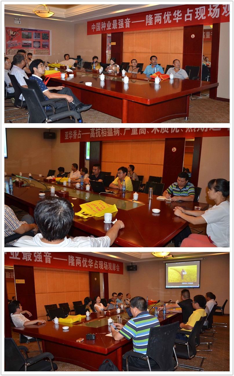在室內(nèi)會(huì)議中,代理商張總首先就隆兩優(yōu)華占的運(yùn)作做了簡(jiǎn)要解說。接著,亞華種業(yè)湖北分公司魏華濤經(jīng)理就產(chǎn)品的特征特性進(jìn)行詳細(xì)分析,亞華種業(yè)湖北分公司總經(jīng)理姜文嘉對(duì)種子質(zhì)量和獨(dú)特性給予補(bǔ)充說明。