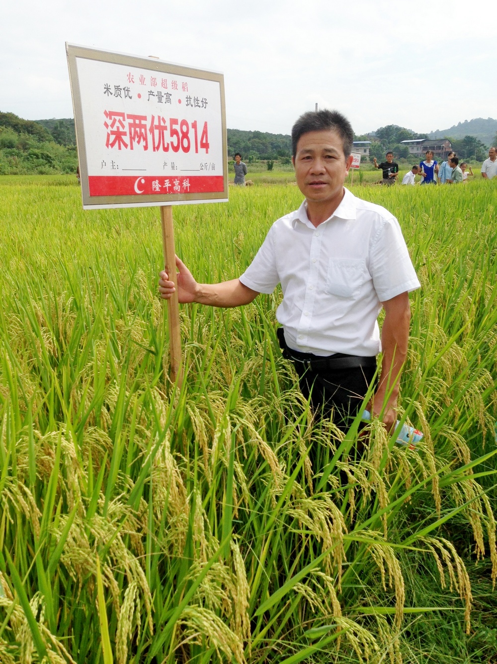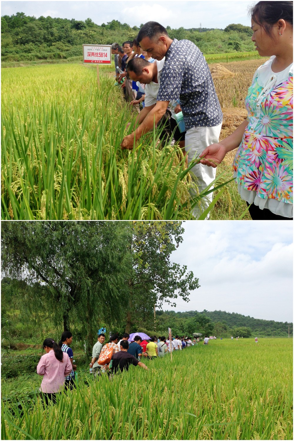 2015年9月4日,祁陽代理商曹寒鐵先生組織祁陽縣100多位鄉(xiāng)鎮(zhèn)種子經(jīng)銷商及種植大戶來到祁陽縣觀音灘鎮(zhèn)聯(lián)興村,現(xiàn)場(chǎng)觀摩該村種植大戶莫學(xué)森連片直播100多畝的農(nóng)業(yè)部超級(jí)稻-深兩優(yōu)5814大田,100多號(hào)人深入現(xiàn)場(chǎng),看著金黃的稻穗,大家都說“真正見識(shí)到高手種植好品種的現(xiàn)場(chǎng)”,個(gè)個(gè)夸贊好。種植戶莫學(xué)森介紹說“2014年我也直播了60畝深兩優(yōu)5814,品種表現(xiàn)好,賺了錢,今年擴(kuò)大面積繼續(xù)直播深兩優(yōu)5814,現(xiàn)在田間表現(xiàn)基本穩(wěn)定了,肯定能賺錢”!觀摩的大戶仔細(xì)查看品種表現(xiàn),對(duì)照自己的種植的情況,詳細(xì)向種植戶打聽技術(shù),盤算著明年的播種計(jì)劃。