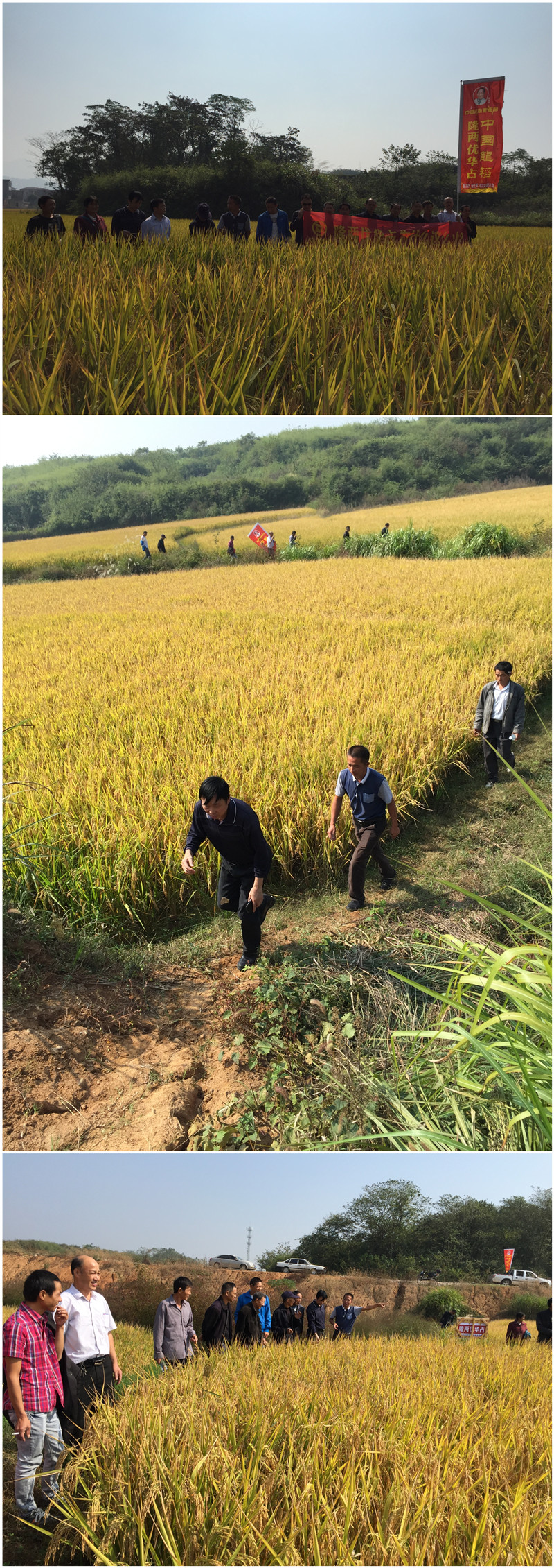 2015年10月18日,清風(fēng)徐徐,紅旗飄飄,江西彭澤縣代理商劉澤小組織了本縣各鄉(xiāng)鎮(zhèn)經(jīng)銷商和種田大戶齊聚黃花鎮(zhèn),成功開展了隆兩優(yōu)華占在彭澤縣的觀摩會首秀。