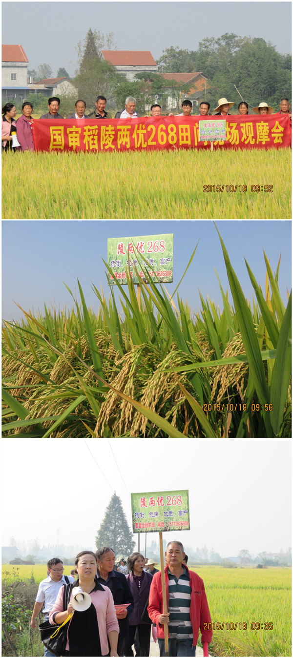 2015年10月18日,湖南澧縣金秋農(nóng)資在素有“澧陽(yáng)平原糧倉(cāng)”之稱的涔南鄉(xiāng)舉辦了由40多位經(jīng)銷商和種植大戶參加的國(guó)審稻陵兩優(yōu)268田間現(xiàn)場(chǎng)觀摩會(huì)。大家參觀了該鄉(xiāng)文家村7組王本生種植的10多畝示范田,老王現(xiàn)場(chǎng)介紹他的栽培要點(diǎn):每畝播種5.5斤,肥水適當(dāng)管理(畝用肥50斤多元素碳銨、20斤鉀肥、追16斤復(fù)合肥),今年預(yù)計(jì)畝產(chǎn)達(dá)1300多斤。他已種植陵兩優(yōu)268四年,年年高產(chǎn),稱得上是晚稻打撒(撒播或稱直播)的首選。當(dāng)大家看到田間金黃色的陵兩優(yōu)268稻穗時(shí),它的株桿挺拔、穗大粒壯、葉青籽黃,引得農(nóng)戶朋友不住稱贊,并情不自禁地拍照留影。原先沒(méi)種植過(guò)陵兩優(yōu)268的農(nóng)戶紛紛表示明年一定要大力推廣種植!