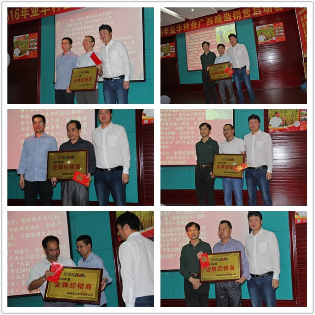 會(huì)議在歡快的樂(lè)曲聲中拉開(kāi)了帷幕。大會(huì)首先表彰了6位2015年度為“深兩優(yōu)5814”推廣佳績(jī)立下汗馬功勞的經(jīng)銷商。授予其亞華“金牌經(jīng)銷商”榮譽(yù)稱號(hào)。其中有5年來(lái)矢志不移以“深兩優(yōu)5814”為核心并在推廣上做出突出貢獻(xiàn)的玉林市金特優(yōu)種子經(jīng)營(yíng)部;有在博白市場(chǎng)憑借“深兩優(yōu)5814”一個(gè)品種之力壓制競(jìng)爭(zhēng)對(duì)手一個(gè)品系的闕總;以及在2015年的市場(chǎng)困境中克難攻堅(jiān),實(shí)現(xiàn)“深兩優(yōu)5814”逆勢(shì)大幅度增長(zhǎng)的靈山縣蘇總、武鳴縣黃總、蒼梧縣李總、八步區(qū)龍總。