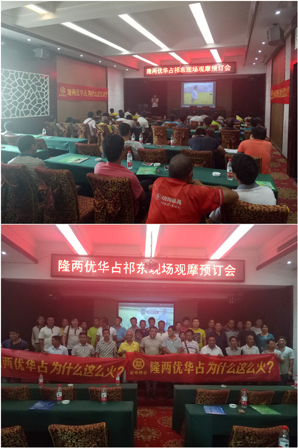 田間觀摩后來到酒店8樓會議室,首先聽取了經(jīng)銷商龍會全的介紹去年種植100多畝隆兩優(yōu)華占平均畝產(chǎn)量1450斤,今年由于種子供應(yīng)緊張改種了,龍總既是經(jīng)銷商又是種田大戶,綜合對比其他品種還是隆兩優(yōu)華占好,穩(wěn)產(chǎn)又高產(chǎn),明年計劃提早預(yù)訂種子加大種植面積。接著湖南亞華種子有限公司的代表向與會人員詳細介紹了公司情況,品種的特征特性和優(yōu)勢,重點介紹預(yù)訂的工作開展,最后祁東利人農(nóng)資公司劉總就隆兩優(yōu)華占的安全穩(wěn)產(chǎn),高產(chǎn),抗病性,抗倒好管理的情況再次進行介紹,就祁東各地的推廣情況進行匯報,詳細地就祁東縣銷售政策和預(yù)訂政策進行公布和解釋。