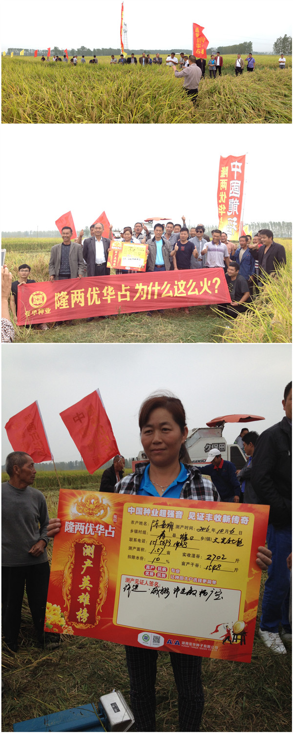 2016年10月6日,正值全國人民歡度國慶、共祝祖國67華誕之際,安徽日禾種業(yè)在安徽壽縣組織了西部部分鄉(xiāng)鎮(zhèn)零售商和種田大戶在該縣堰口鎮(zhèn)成功召開了中國龍稻———“隆兩優(yōu)華占”第三場田間觀摩和實際測產(chǎn)會議。測產(chǎn)田塊每畝手插秧不足8000穴,但由于隆兩優(yōu)華占分蘗率強、成穗率高,現(xiàn)場實際測得畝產(chǎn)干谷1548斤,參會人員都說這品種神了!有勁!
