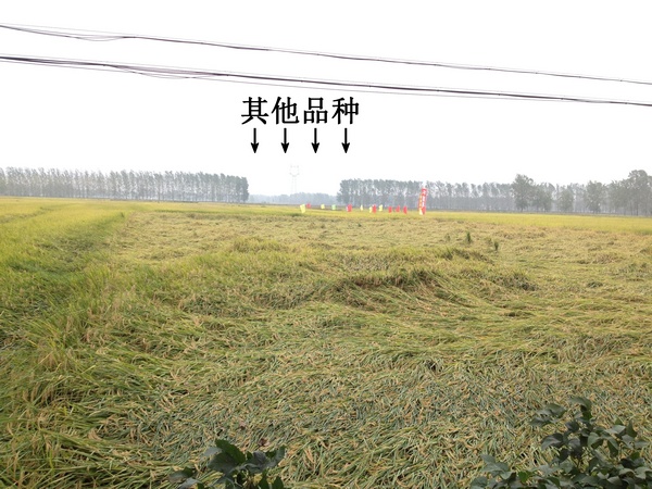 上午10時許,一行40余人來到了位于壽縣堰口鎮(zhèn)大光社區(qū)水稻種植大戶陳善明的隆兩優(yōu)華占田塊里。車子停在路邊剛下車就看見了隆兩優(yōu)華占測產(chǎn)田塊里的水稻就像與之相輝映的彩旗一樣,迎風飄揚、英姿颯爽。而與之形成鮮明對比的是相鄰的上年度某暢銷品種田塊,出現(xiàn)大面積倒伏,足以襯托出隆兩優(yōu)華占在抗倒方面的較強優(yōu)勢。