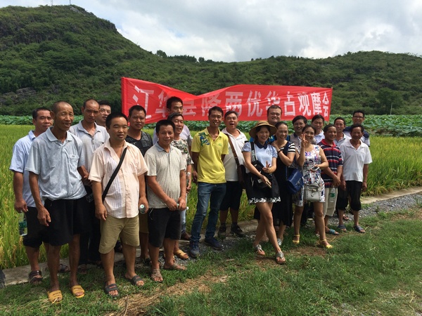 2016年8月14日,江華各鄉(xiāng)鎮(zhèn)經(jīng)銷(xiāo)商及部分種田大戶(hù)齊聚沱江鎮(zhèn)竹園寨村現(xiàn)場(chǎng)觀摩隆兩優(yōu)華占一季稻表現(xiàn),
