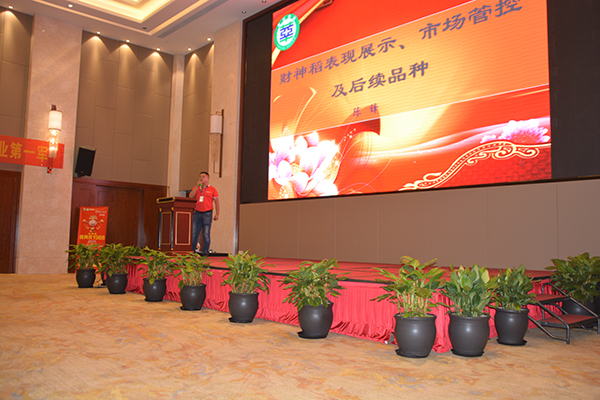 上午10點(diǎn),田間觀摩完畢后大家前往柳園錦江酒店國際會議室入座,開始今天的室內(nèi)會議。會議就開始首先由著名育種專家楊廣院長發(fā)表題為“隆兩優(yōu)1988選育介紹及隆平高科科研創(chuàng)新”的演講,從科研的角度進(jìn)一步闡述了財(cái)神稻隆兩優(yōu)1988的強(qiáng)勢特性。