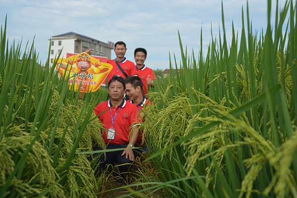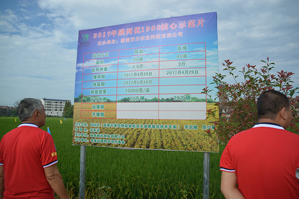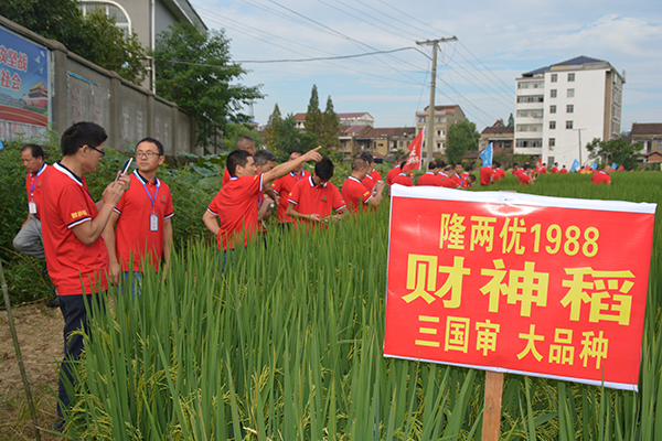 8月19日早上7點(diǎn),一行150多人乘車前往常德鼎城區(qū)周家店示范片進(jìn)行田間觀摩,觀摩分為兩個(gè)片區(qū),一個(gè)為移栽區(qū),一個(gè)為直播區(qū)。播種和移栽時(shí)間均為4月29日和5月30日,移栽田剛齊穗不久,直播田正由乳熟期轉(zhuǎn)為蠟熟期。經(jīng)過觀摩,財(cái)神稻隆兩優(yōu)1988所表現(xiàn)出來的品種優(yōu)勢非常明顯,參與觀摩的經(jīng)銷商及農(nóng)戶無不拍手稱贊。直播田所表現(xiàn)出來的超高抗高溫結(jié)實(shí)率、超多畝有效穗,平均每畝28萬穗等;移栽田表現(xiàn)出的超強(qiáng)分蘗數(shù),穗大粒多,優(yōu)秀的株葉形態(tài)等都說明了財(cái)神稻的絕對優(yōu)勢,抗病抗倒,優(yōu)質(zhì)高產(chǎn),絕對是一個(gè)能給農(nóng)戶帶來財(cái)富的水稻好品種,三國審財(cái)神稻實(shí)至名歸!