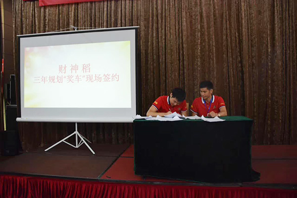 會(huì)議由百分贛閩大區(qū)楊總致開幕詞,并詳細(xì)介紹了與會(huì)代理商重點(diǎn)關(guān)注的2017-2018年度財(cái)神稻的相關(guān)政策,之后與部分核心代理商簽訂了“三年獎(jiǎng)車協(xié)議”,現(xiàn)場(chǎng)反響強(qiáng)烈,氣氛澎湃。