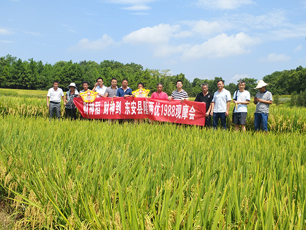2017年8月17日,由東安縣經(jīng)銷商肖友安在永州市東安縣井頭圩鎮(zhèn)陳巖塘主持召開了隆兩優(yōu)1988的經(jīng)銷商觀摩會議。參加此次會議的人員有東安縣知名種子經(jīng)銷商肖友安、亞華種業(yè)百分農(nóng)業(yè)湘南大區(qū)區(qū)域經(jīng)理毛旭東、亞華種業(yè)百分農(nóng)業(yè)湘南大區(qū)區(qū)域經(jīng)理羅琳輝、種田大戶張嫂以及東安各地零售商20余人。