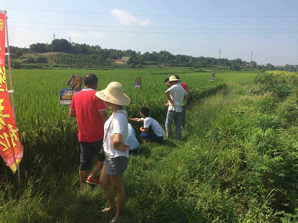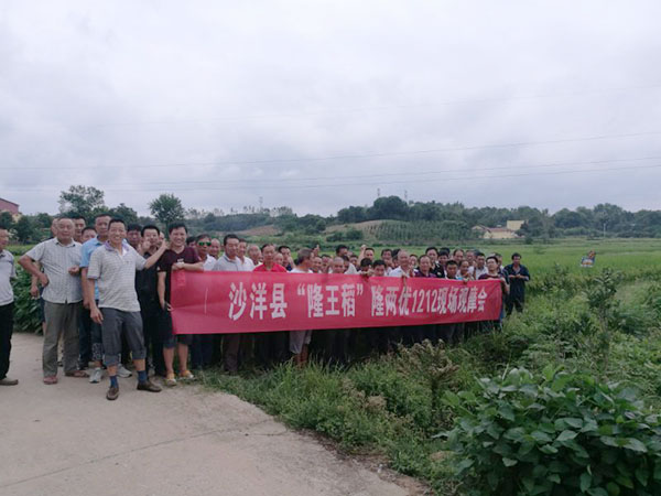 2017年8月21日早上6點(diǎn)半的沙洋王朝酒店門口,隆王稻代理商張方竹和百分胡經(jīng)理組織前來報(bào)到的沙洋經(jīng)銷商和種田大戶前往鐘祥九里鎮(zhèn)黃庵村隆兩優(yōu)1212三十畝連片示范田進(jìn)行觀摩。