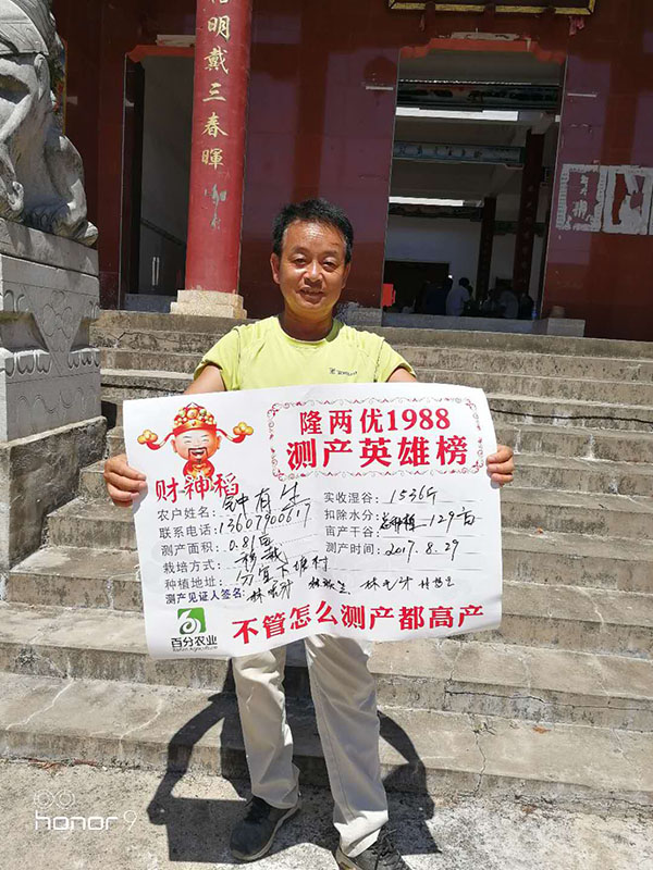 2017年8月29日,江西分宜縣下塘村一百多位種植大戶齊聚田間,只為一睹財神稻隆兩優(yōu)1988的高產(chǎn)傳奇。