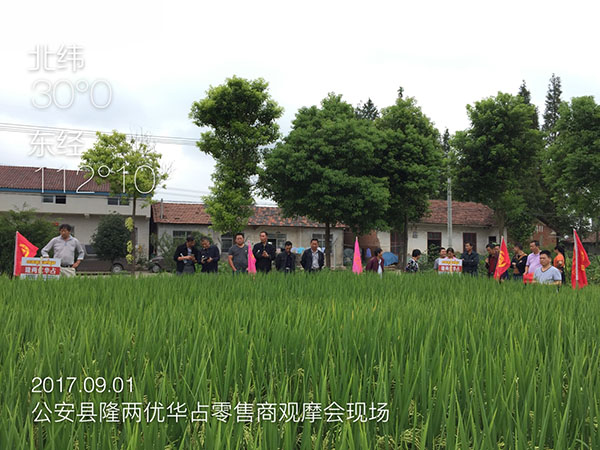 2017年9月1日上午,來自公安縣各鄉(xiāng)鎮(zhèn)的零售商及種植大戶20余人在代理商余總的帶領(lǐng)下,來到位于夾竹園鎮(zhèn)紅星村隆兩優(yōu)華占的田間進(jìn)行現(xiàn)場(chǎng)觀摩。