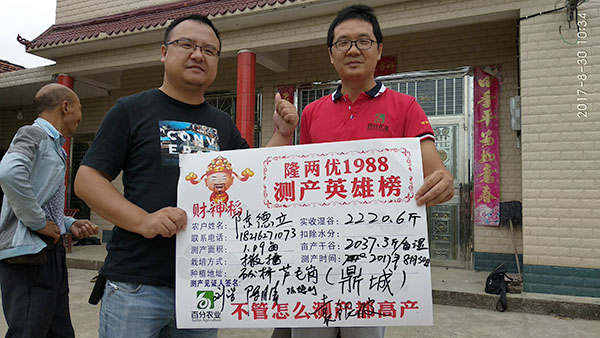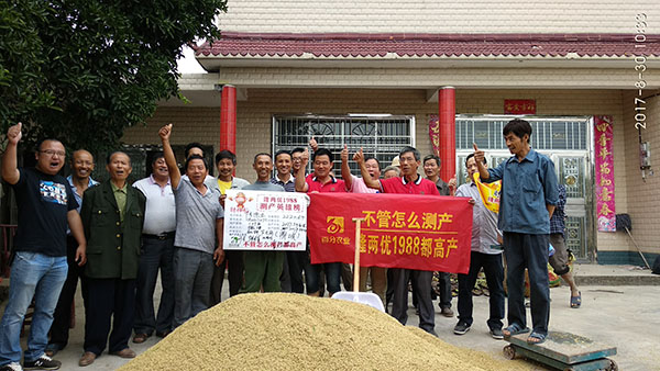 2017年8月30日上午,在應鼎城石公橋經(jīng)銷商陳月清的組織下召開隆兩優(yōu)1988的測產會,參會人員有常德鼎城代理商陳總、袁總、百分農業(yè)湖南大區(qū)劉浩經(jīng)理、鼎城區(qū)高級農藝師周老師和陳老師及28位零售商、種植大戶和農戶。