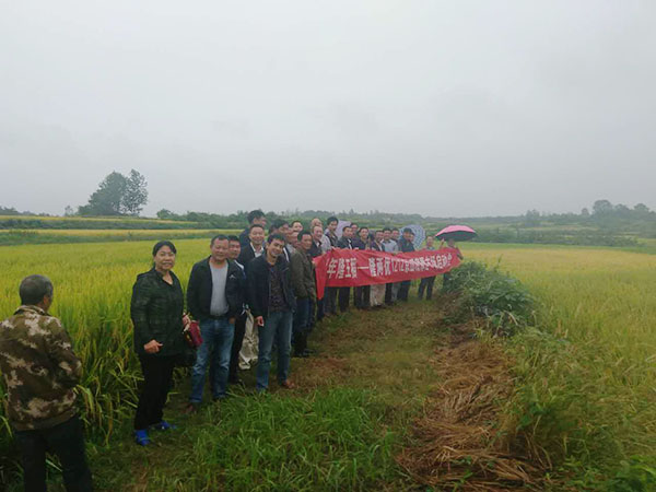上午9點(diǎn)京山縣隆王稻——隆兩優(yōu)1212的各鄉(xiāng)鎮(zhèn)經(jīng)銷商合作伙伴準(zhǔn)時在京山豪威大酒店集合。9:10我們從京山縣向隆王稻——隆兩優(yōu)1212的示范田出發(fā)。一到示范田,車子剛剛停穩(wěn),隆王稻的各位合作伙伴都迫不及待地來到田間目睹它神秘的面容。就在此時,天空下起了豌豆大的雨滴。世人都講,山管人丁,水管財。這也預(yù)示著是一個豐收年。