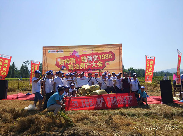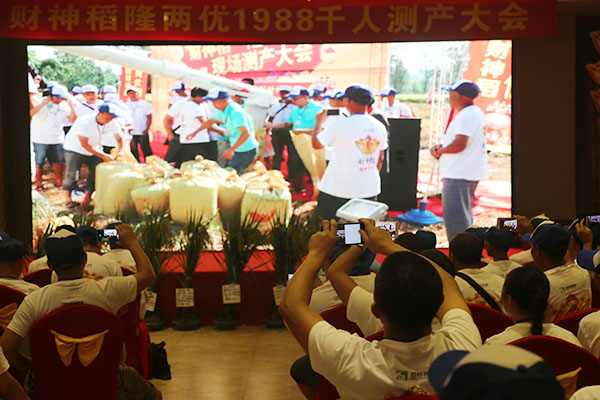 當(dāng)天,重慶各個區(qū)縣的水稻經(jīng)銷商、種糧大戶和村民代表等六七百人,通過到現(xiàn)場觀摩或在酒店觀看電視直播方式,一起見證了隆兩優(yōu)1988水稻在新盛鎮(zhèn)新盛村種植的情況。經(jīng)過對唐洪平種植的1.3畝水稻進行機收測產(chǎn),平均畝產(chǎn)量達1965.27斤,成為梁平最高水稻畝產(chǎn)量,高出村民種植的常規(guī)水稻700斤左右。