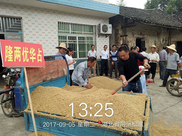 2017年9月5日,一場隆兩優(yōu)華占的觀摩測產(chǎn)會在松滋市楊林市鎮(zhèn)舉行。參加此次測產(chǎn)會的農戶是附近村組的種田大戶,他們放下手中的農活,興致勃勃地參與其中。