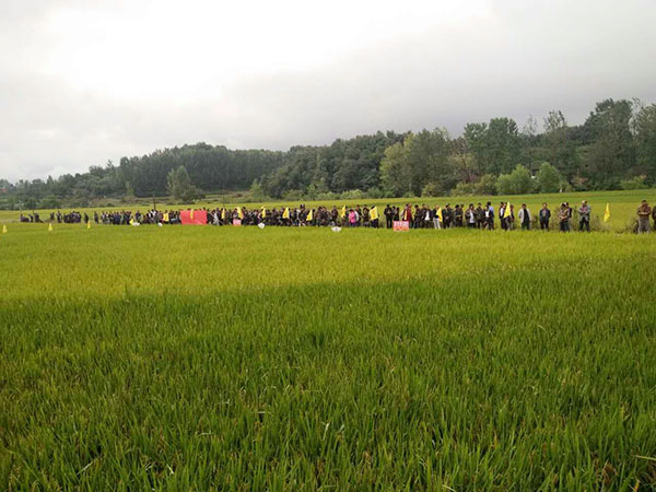 上午8點,來自各個鄉(xiāng)鎮(zhèn)共計308名經(jīng)銷商和農民朋友在棗陽市代理商吳總的組織下乘車前往,浩浩蕩蕩的車隊將參會的300多人載到棗陽市清潭鎮(zhèn)財神稻——隆兩優(yōu)1988的示范田。300多人有序地朝著周光寶師傅家的田塊走去。一到周師傅家的田里,300多人都對今年財神稻隆兩優(yōu)1988的結實率所折服,紛紛豎起了大拇指。還有很多人猜測,至少有1800斤/畝。大家都到齊后,胡經(jīng)理給大家介紹了財神稻隆兩優(yōu)1988的品種特性,接下來周光寶師傅對自己的田塊如何種植做了簡短地介紹,從他的言語中表露出對今年財神稻隆的表現(xiàn)非常滿意。