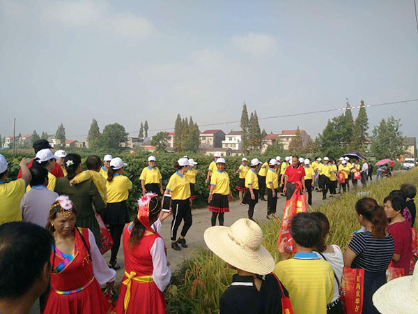 會場的氣氛好不火爆,荊州電視臺至此進行全程的跟蹤報道,雙機位加航拍的豪華配置,好像在擔心會錯過任一細節(jié)。看!田邊突然出現(xiàn)一道金黃靚麗的風景線,走近一看,原來是云集的跳舞大媽前來以舞慶祝!這,就是隆兩優(yōu)華占的測產(chǎn)觀摩會!