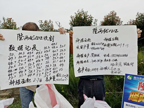 田的面積不大,但收割的產(chǎn)量卻并不少,2.7畝田,收獲了52袋谷子5227斤,折算每畝收獲1936斤濕谷,扣除20%的水分,干谷產(chǎn)量高達1549斤/畝田。當問及種植戶賀祖發(fā)對隆王稻——隆兩優(yōu)1212這個品種是否滿意時,他回答到:“種隆王稻,我不后悔”。