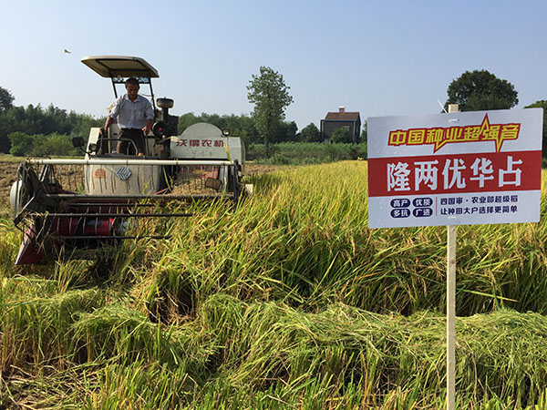 農(nóng)戶龔天柱站在田埂上,看著隆兩優(yōu)華占的宣傳單頁,饒有興趣地念著這段詩句。他既是百畝種植大戶,也是附近村莊的收割機操作員。今天是2017年9月15日,天氣晴朗,他將和來自孟溪鎮(zhèn)各村莊的二十余名種植大戶一起見證隆兩優(yōu)華占的豐收時刻。