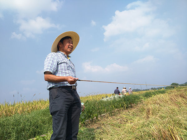 接下來是實測收割田塊面積,“那里沒扯到頭啊,放到邊上”,“怎么沒拉直啊,斜了斜了,擺直些”,“中間皮尺被稻樁撐起來了,把它弄下去,拉直了”。整個測量過程中驗收組專家們一直非常嚴(yán)謹(jǐn),頂著下午的烈日,站在田埂里三個小時,直到完成田間收割工作。