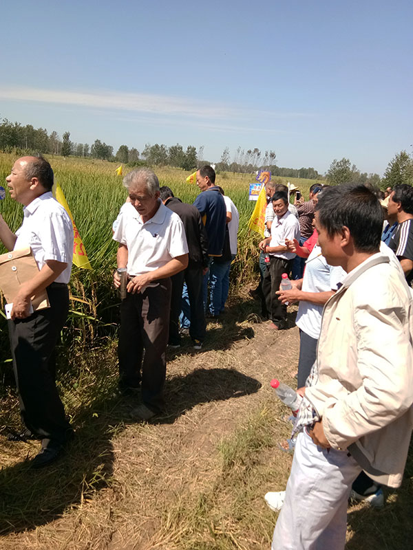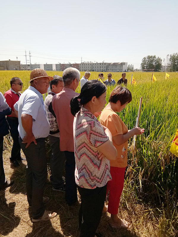 在途中,大家都看到了將近5個品種已經(jīng)“睡”在地上了。到達示范田后,插牌和小彩旗都被吹傾斜了,只見隆王稻依舊佇立在田中,株型清秀整齊、劍葉內(nèi)卷挺直、結(jié)實率高達90%以上,株高適中,該田種植戶甚是滿意?,F(xiàn)場馬老師為大家講述了隆兩優(yōu)1212的五大優(yōu)勢:“1,隆王稻株型整齊劃一,是他目前見過的最好看的品種。2,隆王稻抗高溫能力強,結(jié)實率高。 3,隆王稻基部莖桿粗壯根系發(fā)達,抗倒性好。4,隆王稻抗稻瘟病能力強,示范兩年未見一起。5,隆王稻穗子稻谷緊湊,粒型整齊,堊白粒率低,米質(zhì)好”。現(xiàn)場農(nóng)戶對隆兩優(yōu)1212的結(jié)實率和抗性給予了高度的認(rèn)可,紛紛拍照留念。